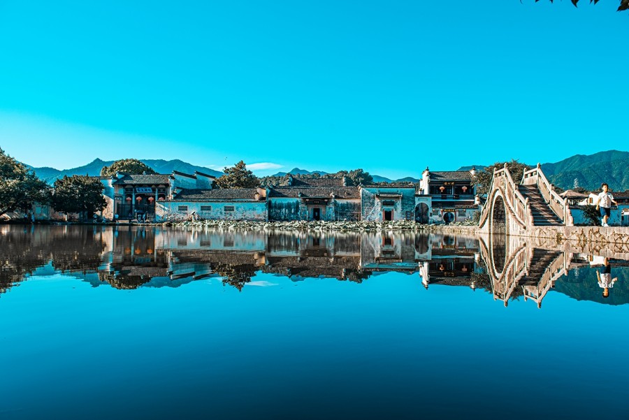 至此青山融墨绿,满房清梦压星河。宏村位于安徽省徽州六县之一的黟县东北部,整个村依山伴水而建,村后以青山为屏障,阵势高爽,有瞻仰山色泉声之乐,被誉为“画中的墟落”。(大梵宇矿 刘贝贝)
